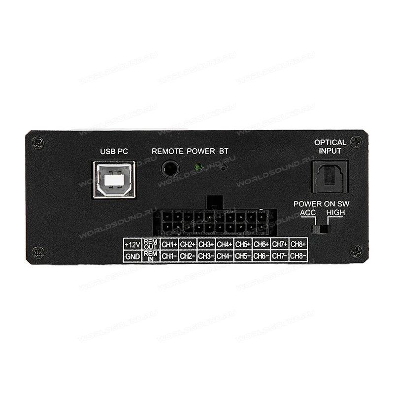 Десятиканальный конвертер уровня со встроенным процессором DSP от Deaf Bonce. Предназначен для соединения головных устройств через входы высокого или низкого уровня сигнала либо по оптике к стандартным RCA-выходам.