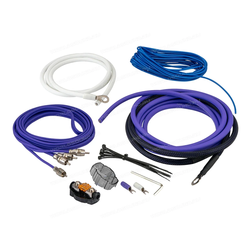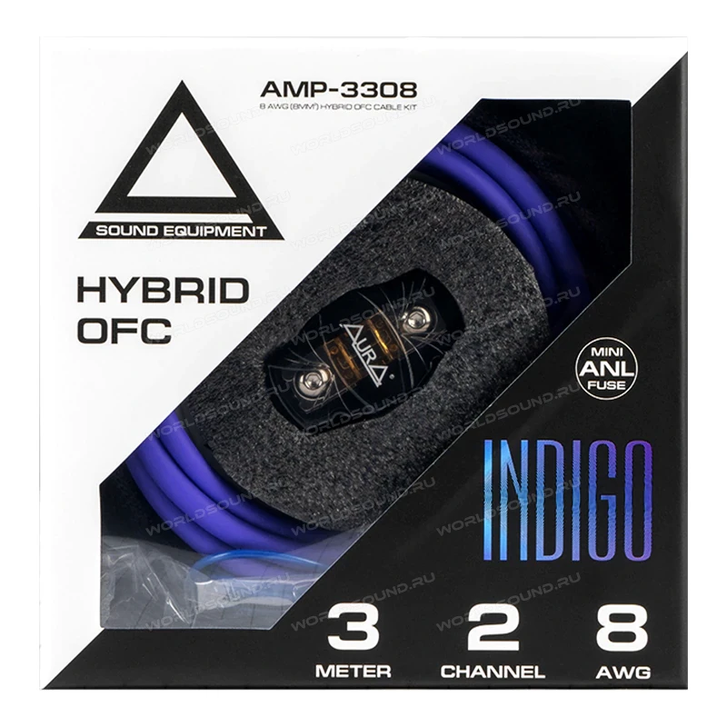 Установочный комплект проводов Aura Indigo для двухканального усилителя. Гибкие силовые кабели HYBRID-OFC (луженая бескислородная медь 75% + луженый алюминий 25%), межблочный коаксиальный кабель (бескислородная медь 99,99%) и все необходимые клеммы и аксессуары.